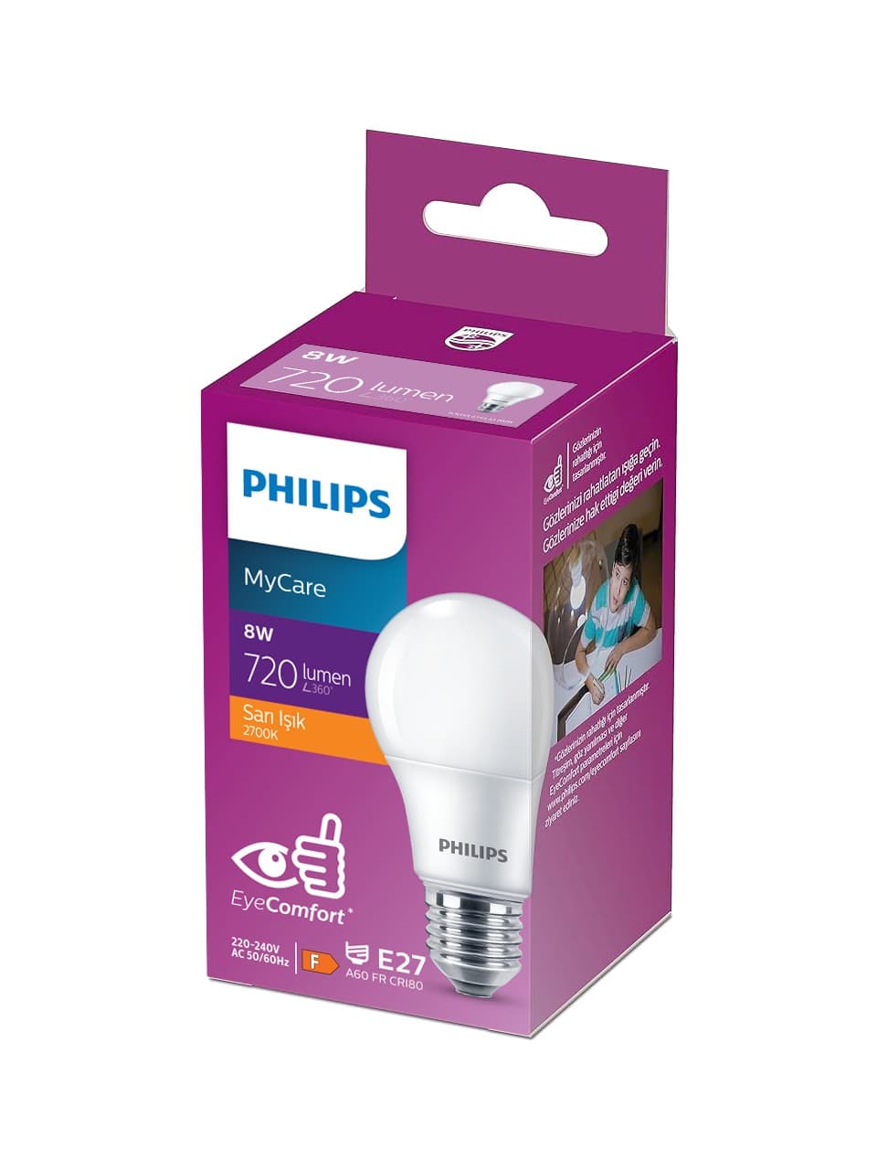 Philips MyCare 8W LED ampul, E27 duylu armatürlerle uyumludur ve 720 lümen ışık akısı sunarak aydınlatmada yüksek performans sağlar. 2700K sıcak sarı ışık, doğala yakın bir aydınlatma sunar ve ortamları ferahlatır. Düşük enerji tüketimi ve uzun kullanım ömrüyle tasarrufu öne çıkarır. EyeComfort teknolojisi ile göz yorgunluğunu azaltmak üzere optimize edilmiştir.